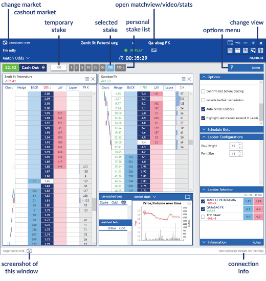 The ladder view is one of the most popular views in trading software, because it’s very useful and it isn’t available at the Betfair site. It gives you an intuitive overview of the odds ladder, so you can quickly notice how the market is behaving and place bets that will be immediately matched or stand in line to be matched as soon as the market moves.