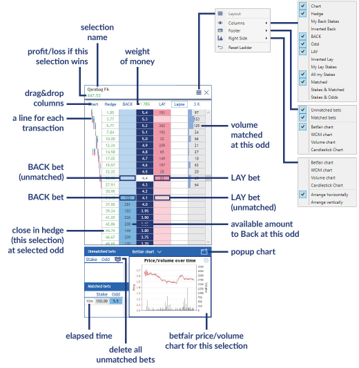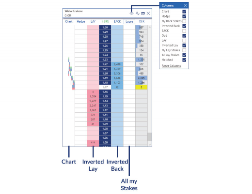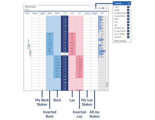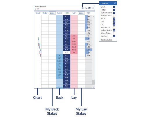 The intuitive ladder betting interface has got a customizable layout made up of drag & drop columns. Moreover, by clicking the hamburger icon you can customize which columns to see, chart and bets list in the footer area, and create an enhanced ladder view adding special charts on the right side of each ladder. The Reset Ladder option reverts all changes made to the ladder layout.