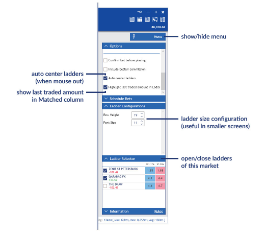 There are 2 areas in the ladder view. The ladders are presented in the center and there is a collapsible menu on the right side, the options menu, which has staking options, scheduled bets and market rules, just like the Grid view, and it also has a few unique options, which are explained in detail in Menu Sidebar.