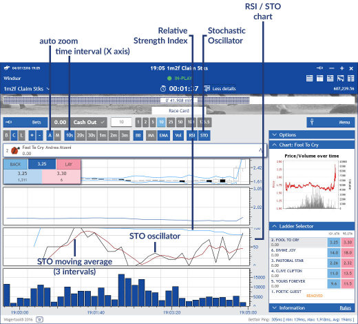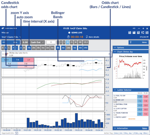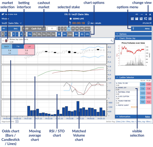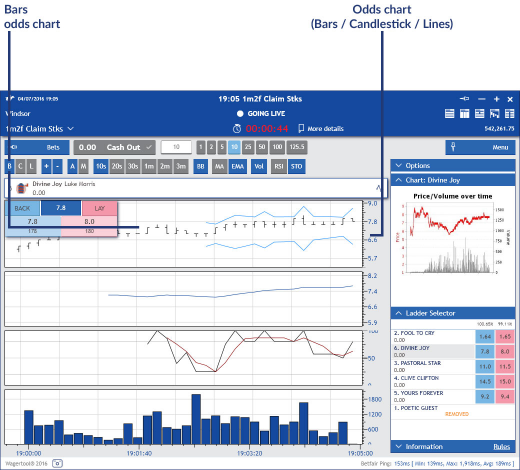On the top left corner of the main area there is a small betting interface with the best BACK (blue) and LAY (pink) odds available and the Last Traded Price in dark blue. You can place bets by clicking the BACK or LAY odd. But if you wish to place bets at different odds you can click the LTP to access a small ladder. Note that these are basic betting interfaces, so not all options are available, like betting with a right mouse click in the grid.