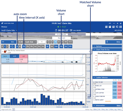 In the main area, you can have up to 4 Wagertool charts, apart from the common Betfair Price/Volume chart: