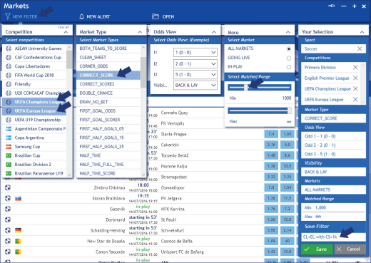 Ejemplo de un filtro: partidos de las principales ligas europeas con más de 1000€ transaccionados en el mercado “Correct Score”.